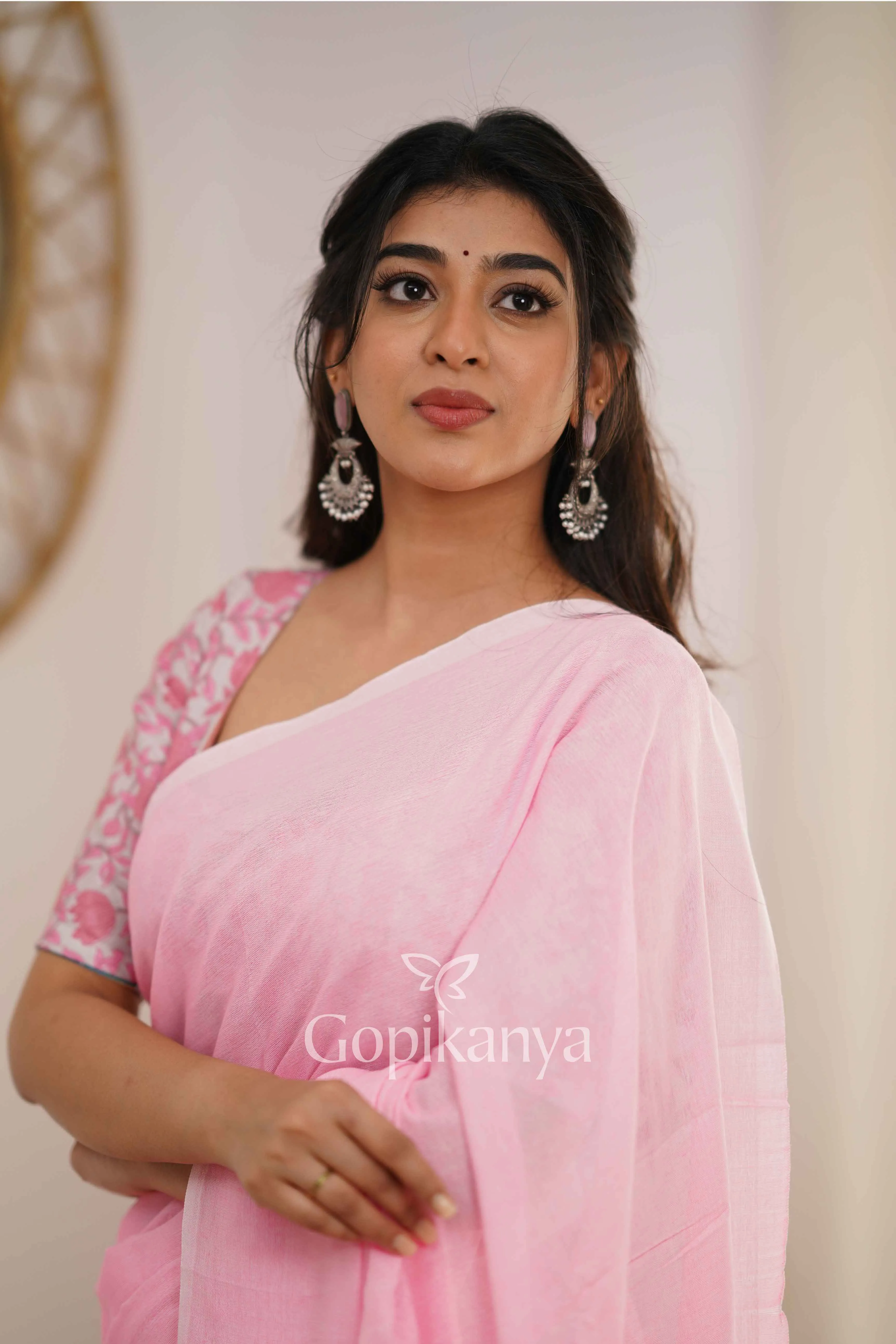 Baby Pink Handloom Cotton Saree With Leaf Printed Blouse