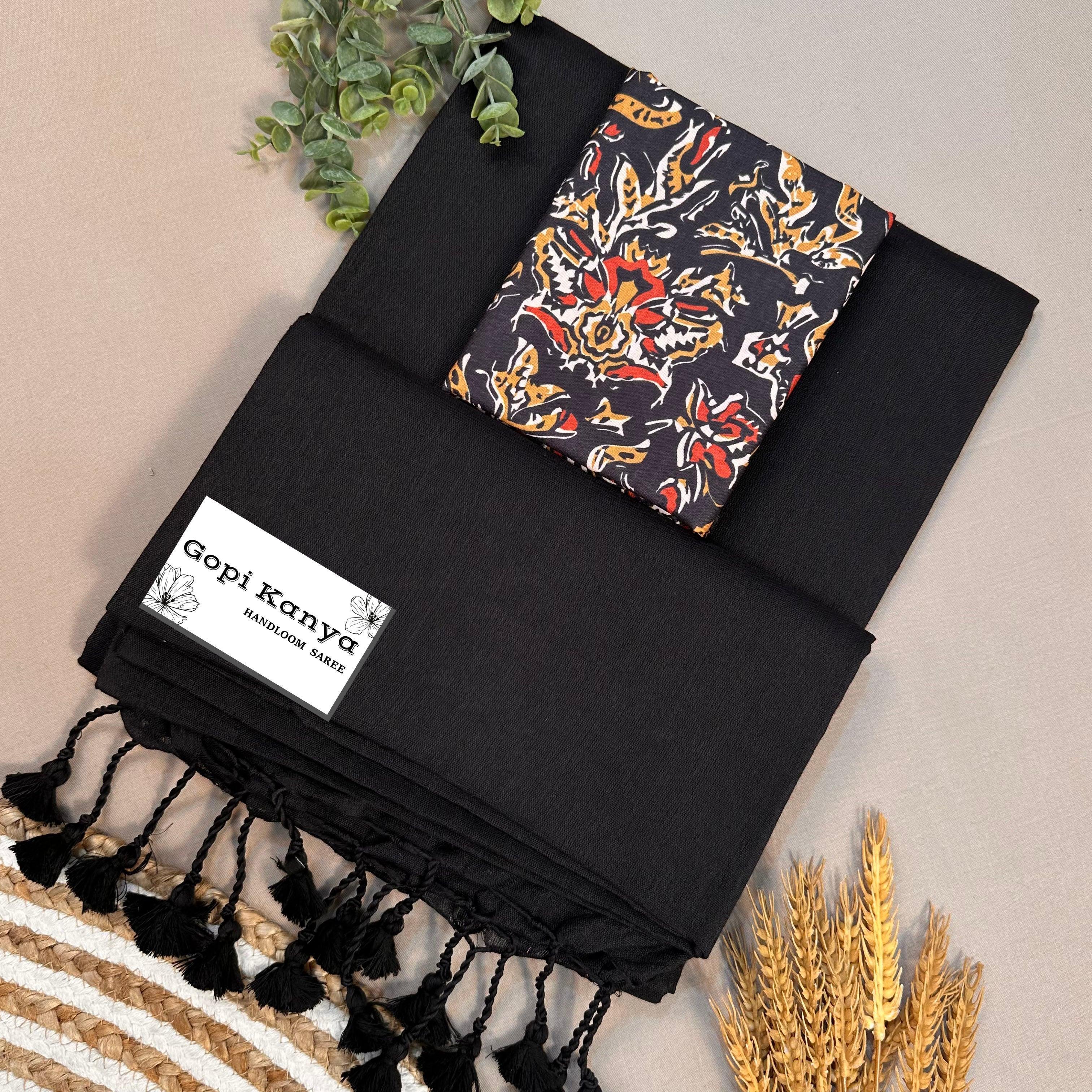 -70%Black Khadi Cotton Saree With Printed Blouse—