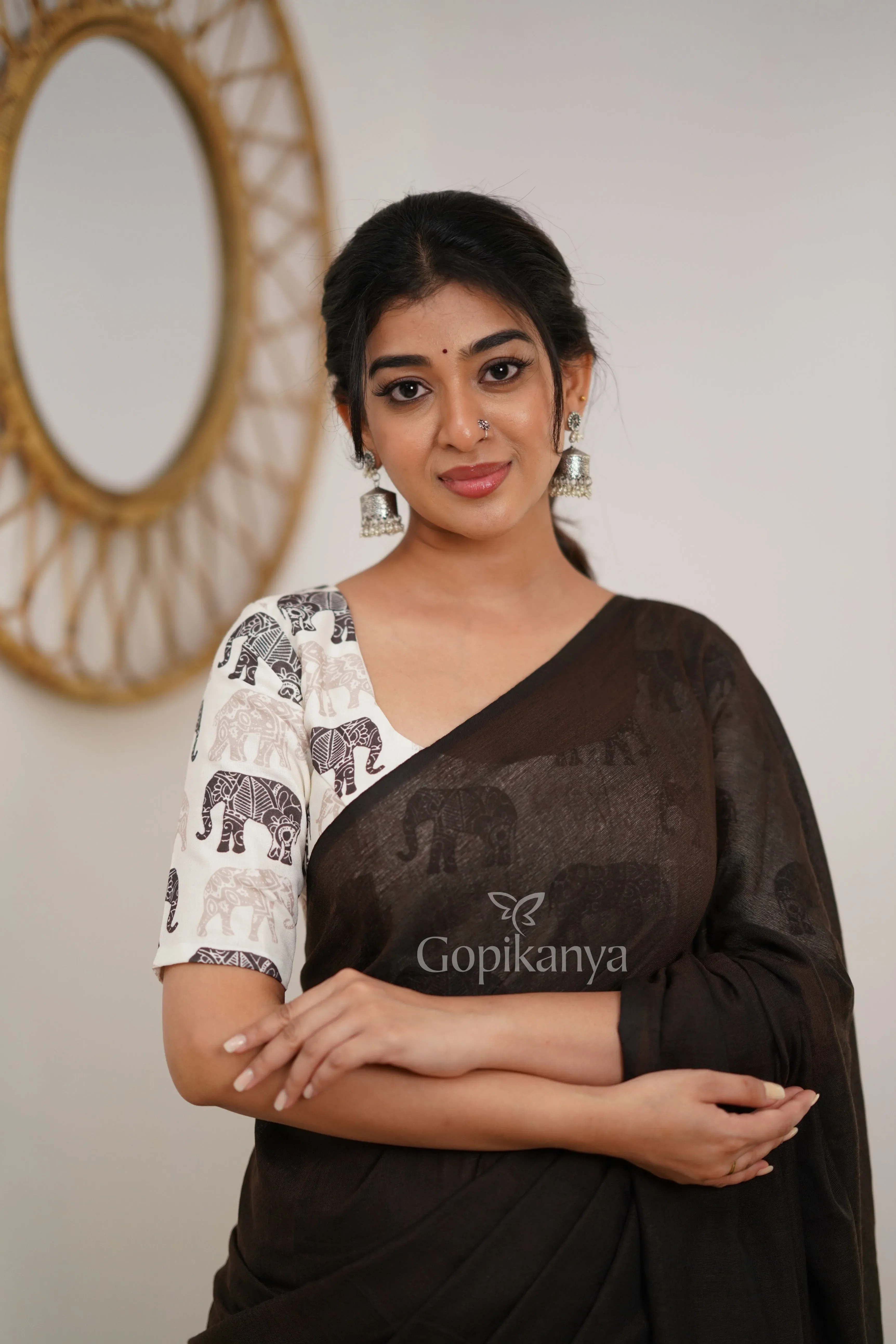 Brown Handloom Cotton Saree With Elephant Printed Blouse