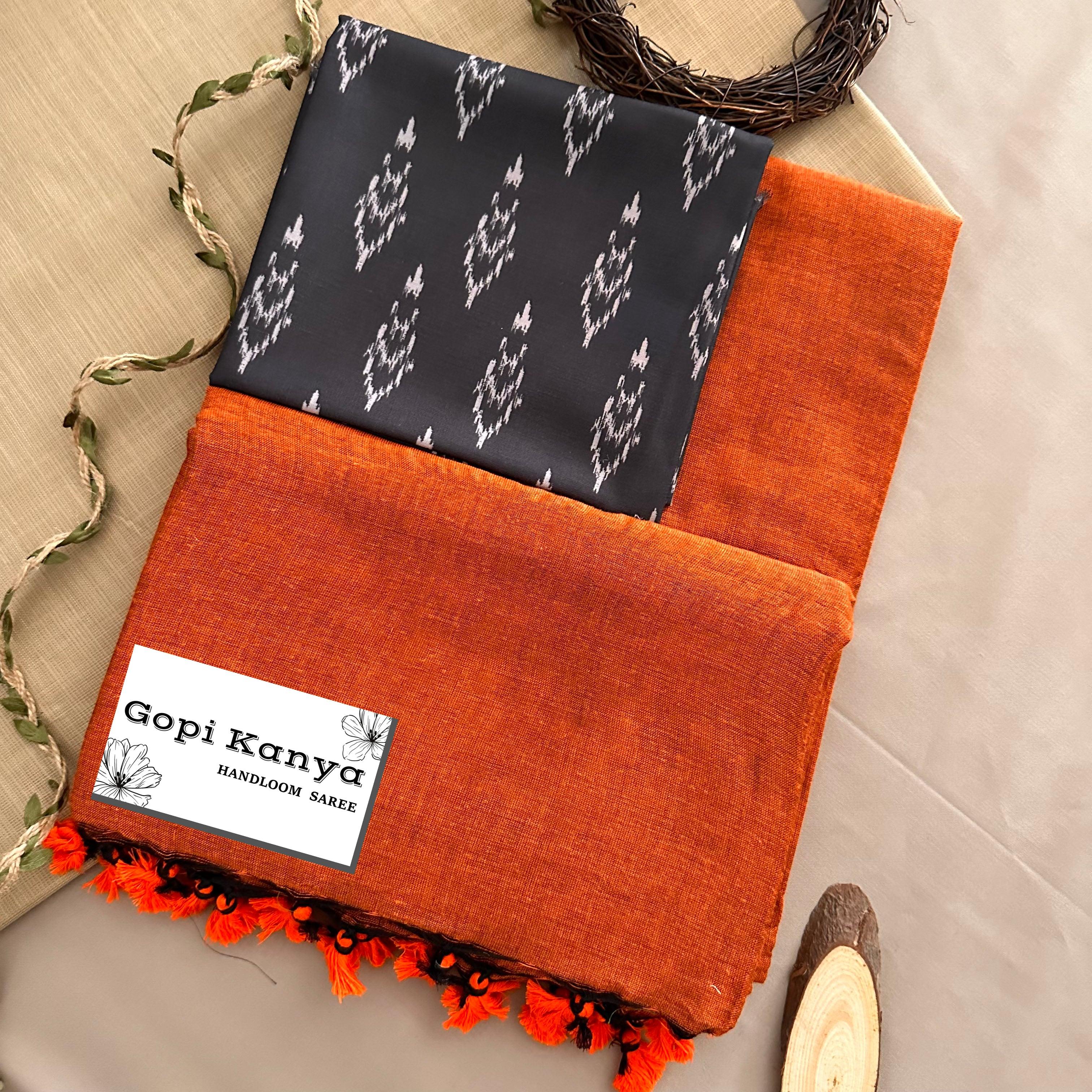 Orange Khadi Cotton Saree With Printed Blouse—