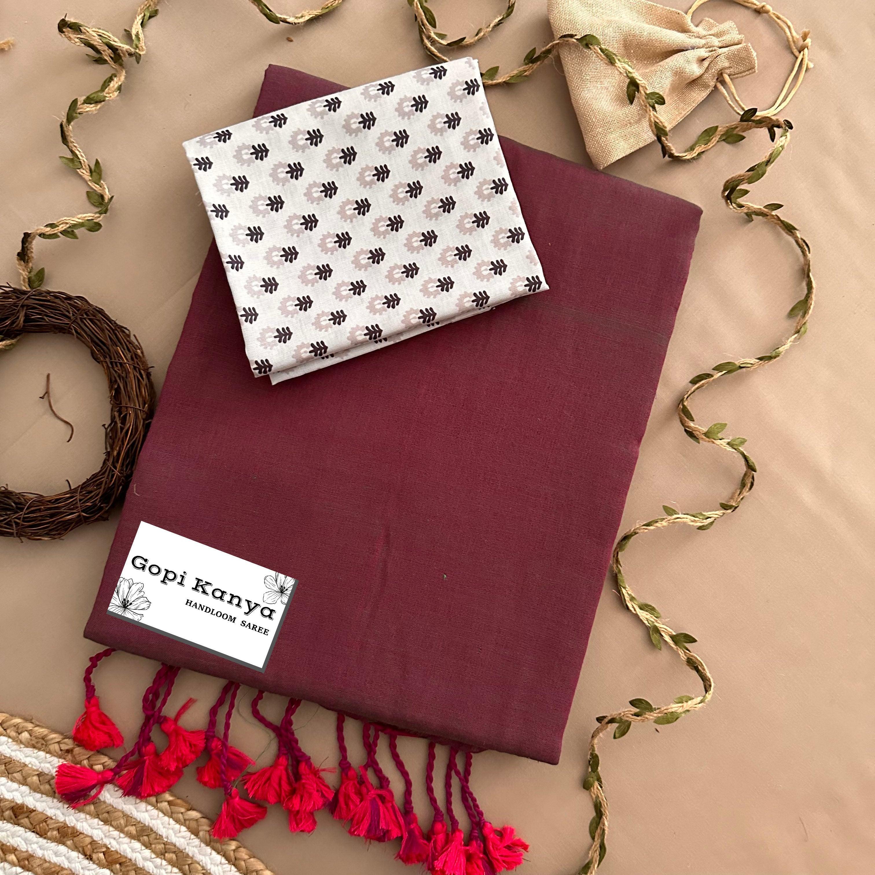 Light Wine Khadi Cotton Saree With Printed Blouse—