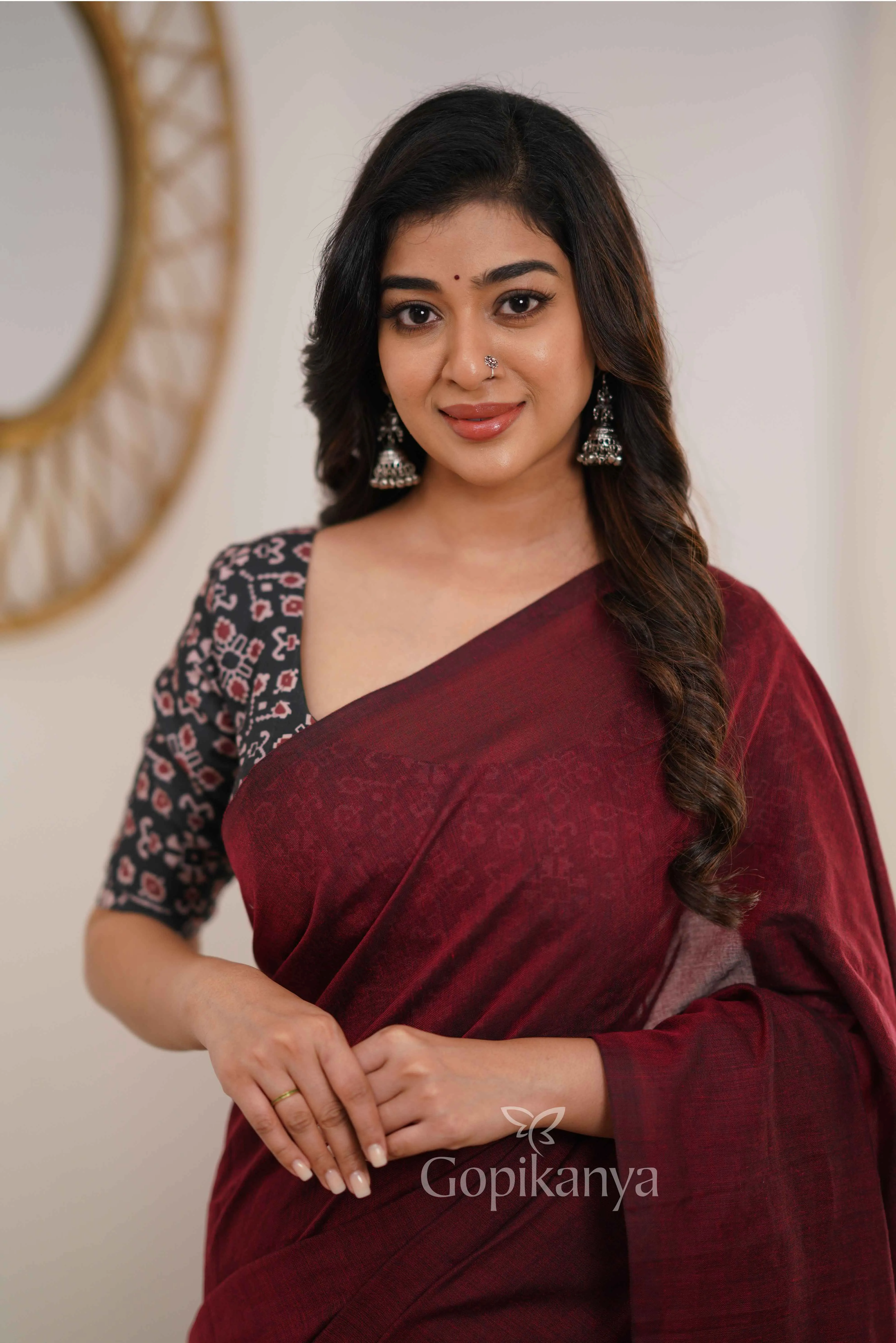 Marun Handloom Cotton Saree With Black Patola Printed Blouse