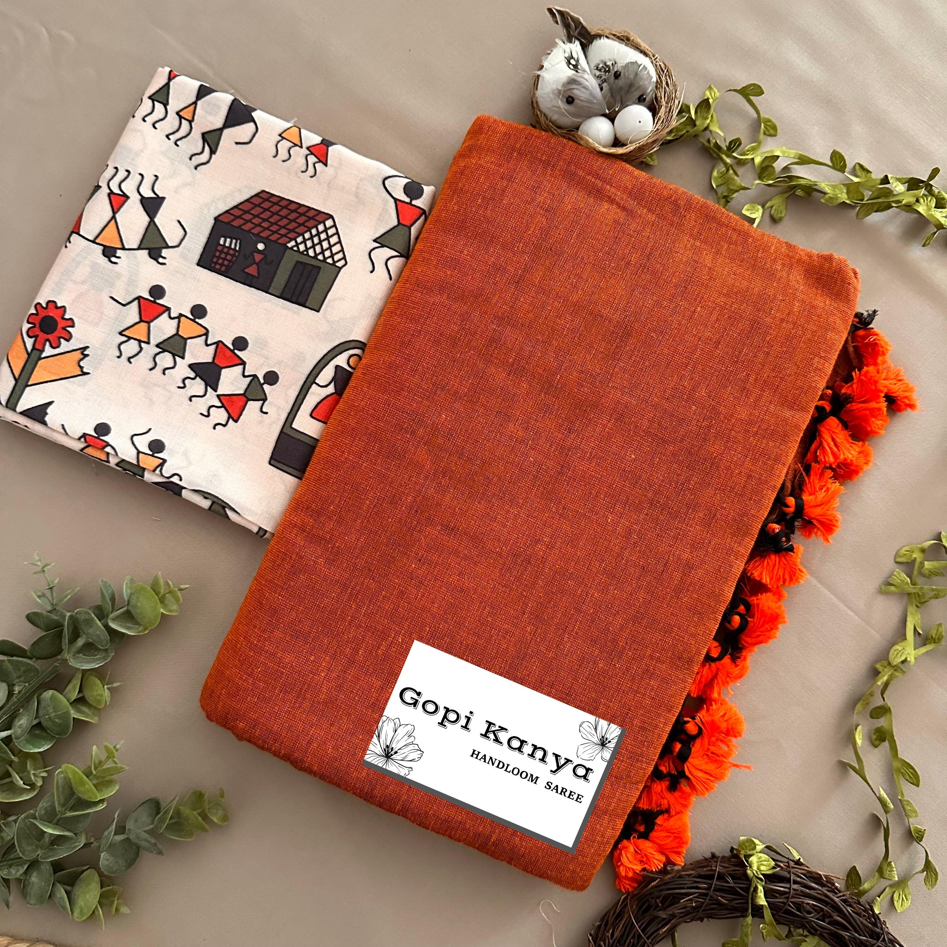 Orange Khadi Cotton Saree With Printed Blouse