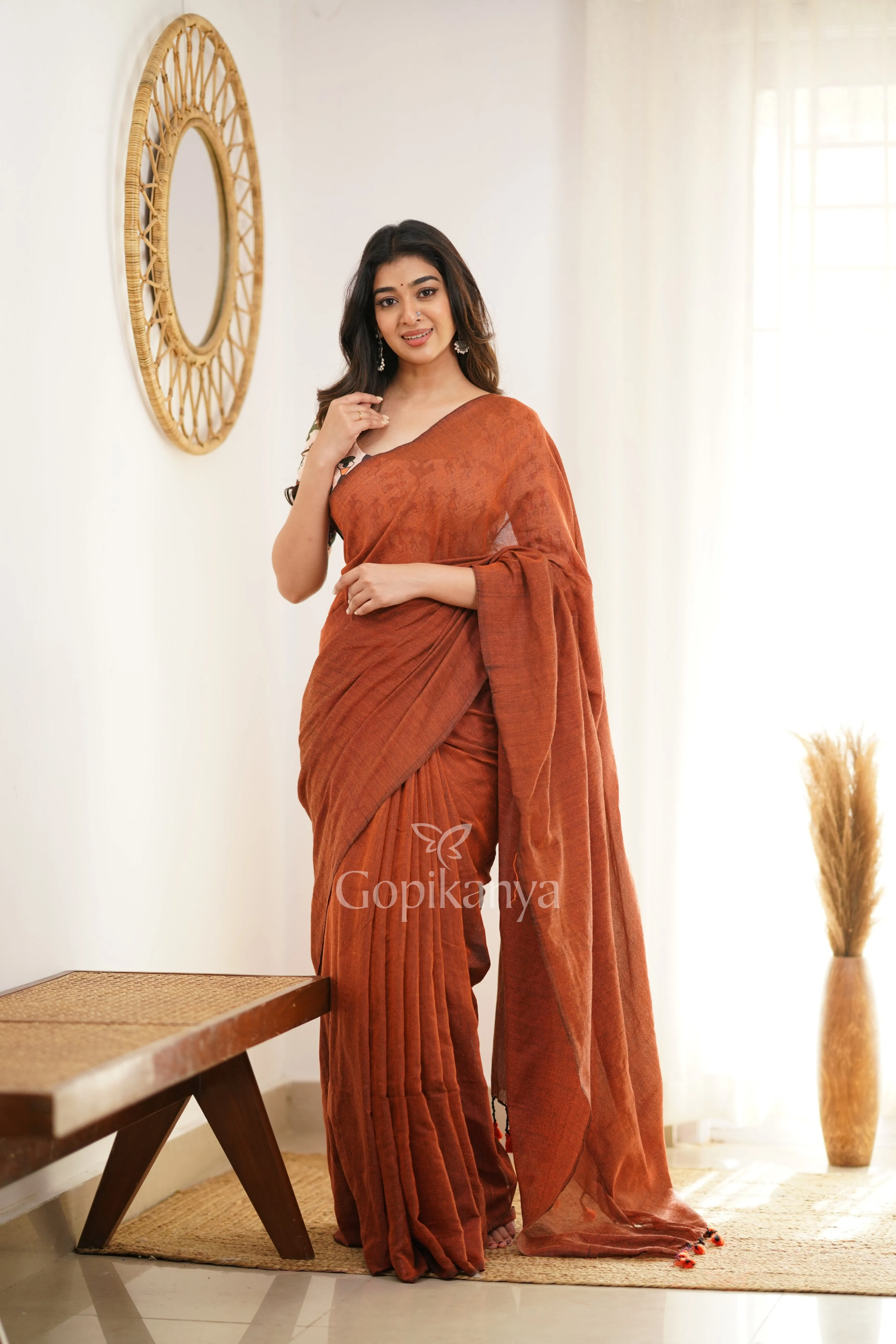 Orange Handloom Cotton Saree With Vani Printed Blouse