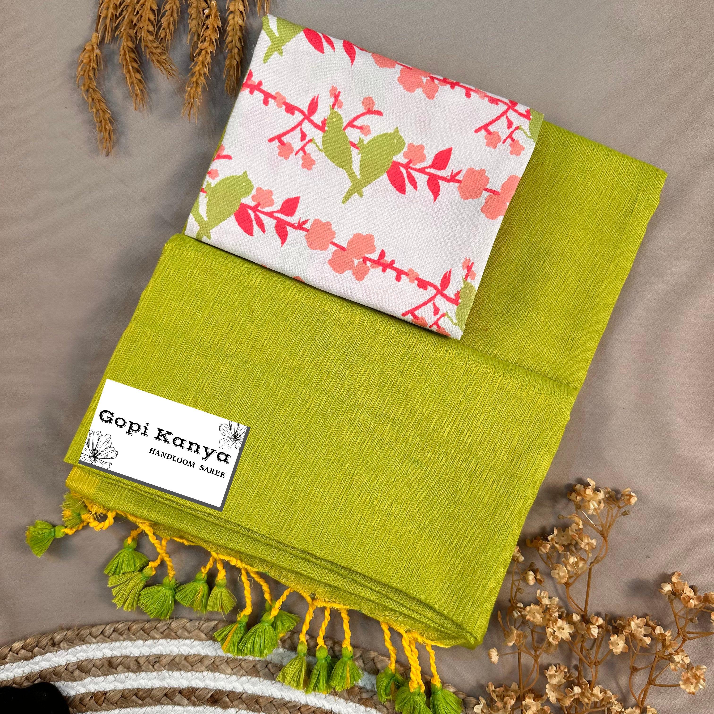 Perrot Green Handloom Cotton Saree With Printed Blouse