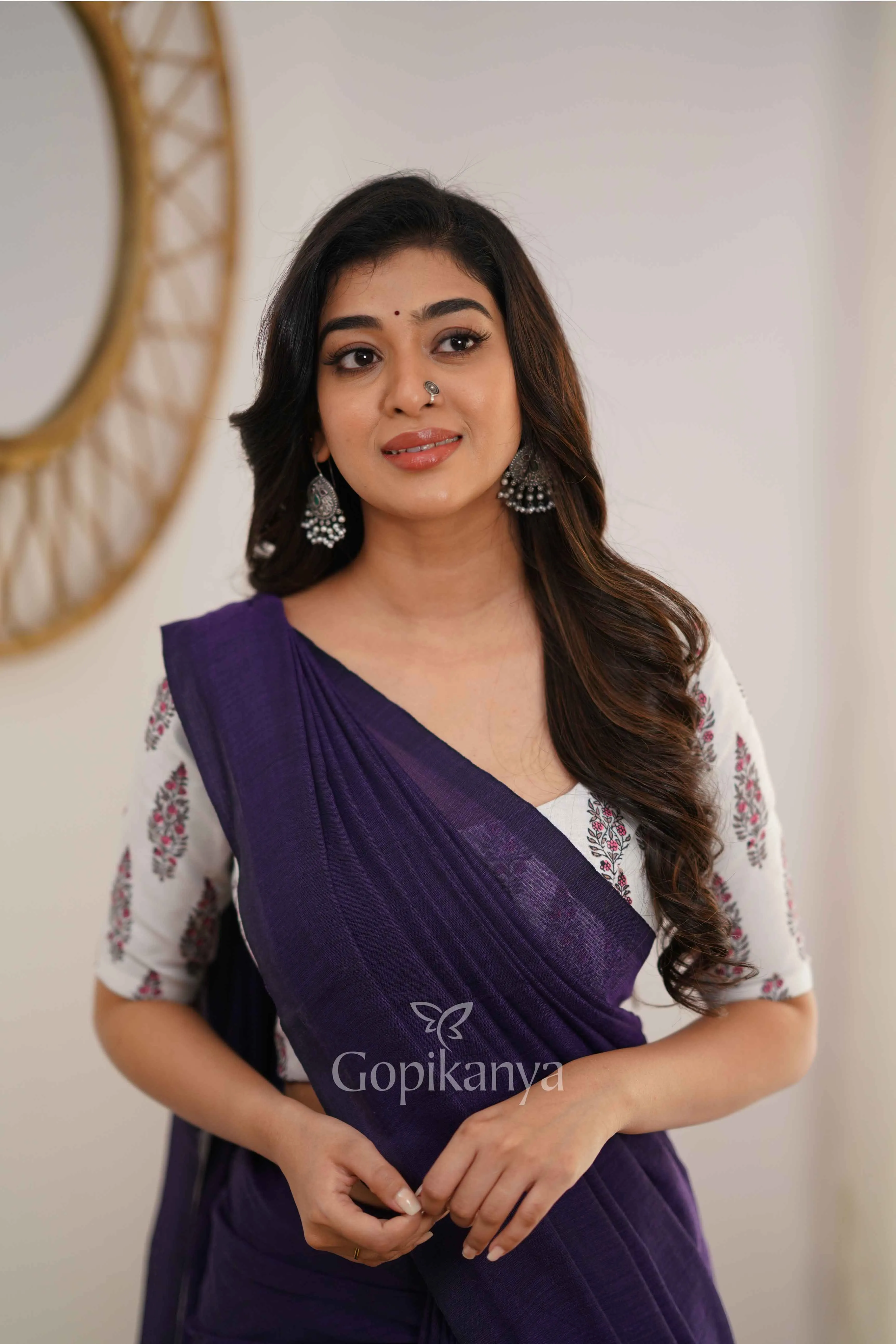 Purple Handloom Cotton Saree With White Designer Printed Blouse